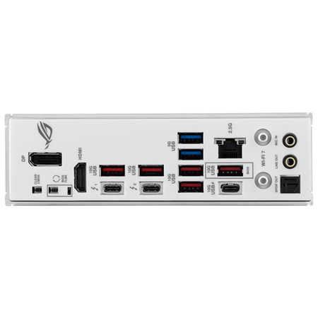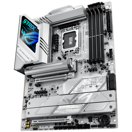 The ROG Strix Z890-A features a sleek white surface for a contemporary and stylish appearance that fits effortlessly into most system builds. Metallic heatsinks complement the clean design, while subtle Polymo lighting on the I/O shroud lets you choose between a refined, minimalist look or a vibrant, eye-catching display.