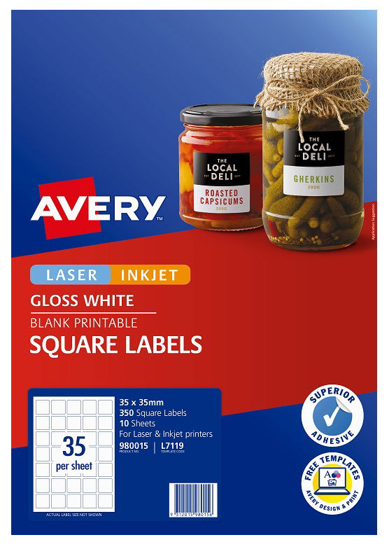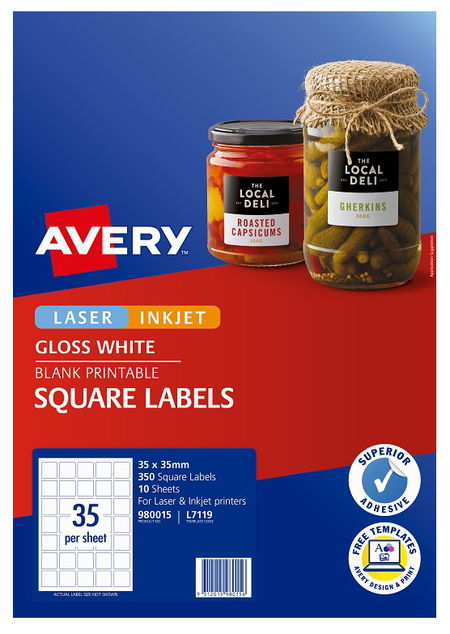 Avery L7119 Glossy White Laser Inkjet 35mm Square Permanent Product Labels - 350 Pack