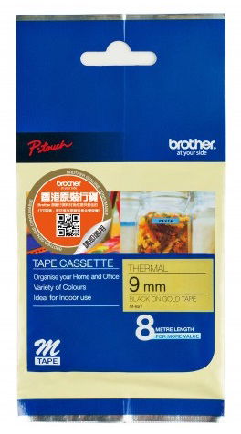 Brother M821 Black On Gold P-touch Label Maker Tape, 3/8 In. X 26.2 Ft. This non-laminated tape comes with standard strength adhesive and is recommended for home and indoor use only. Best suited for flat dry surfaces. Perfect for school projects, file folders, and other basic labeling needs.