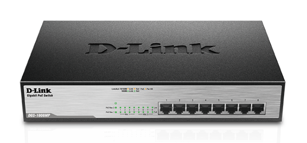 - The DGS-1008MP features 8 x 10/100/1000BASE-T ports that support the IEEE 802.3at PoE+ protocol. Each of the 8 PoE+ ports can supply up to 30 watts with a total PoE power budget of 140 watts. PoE is especially suitable for devices that are far from power outlets or when you want to minimise the clutter of extra cables.