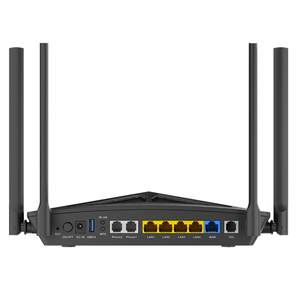 - Device Interfaces: 4 x Gigabit Ethernet LAN ports, 1 x Gigabit Ethernet WAN port, 1 x RJ-11 xDSL port, 2 x FXS VoIP ports, 1 x USB 3.0 port, IEEE 802.11 ax/ac/n/g/b/a wireless LAN