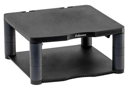 Positions the monitor at a comfortable viewing height and helps organise the workstation around the monitor.