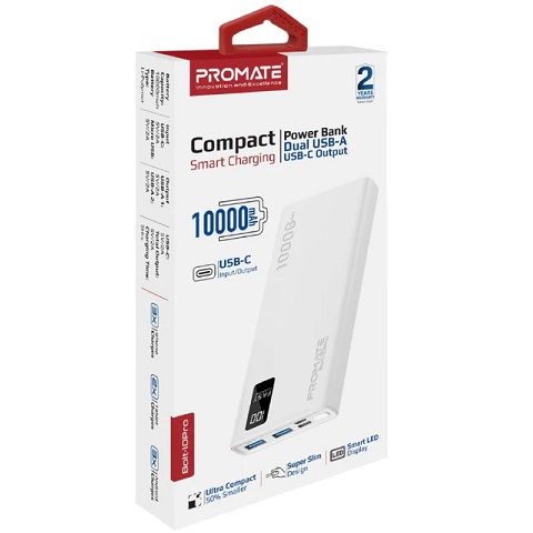 Promate Bolt-10Pro 10000mAh USB-A & USB-C Power Bank - White