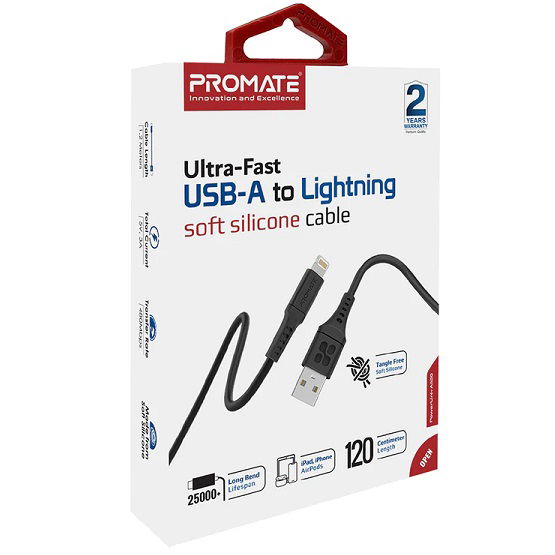 Promate PowerLink-Ai120 1.2m Ultra-Fast USB-A to Lightning Data & Charge Soft Silicone Cable - Black