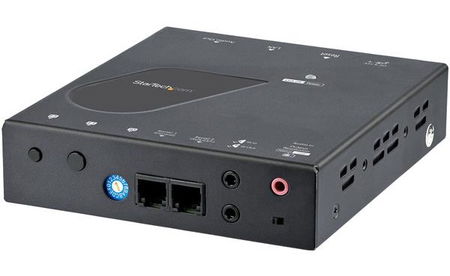 This HDMI over IP receiver works with the HDMI Over IP Extender Kit (ST12MHDLAN2K, sold separately) and an Ethernet switch (sold separately), to receive HDMI video over your local area network (LAN) in remote locations, using Cat5 or Cat6 cabling. You can use additional receivers to distribute the HDMI signal to multiple locations or combine your remote displays to create a video wall.