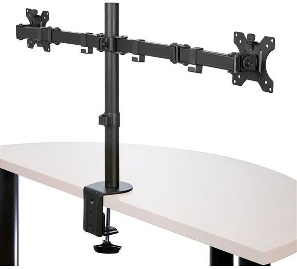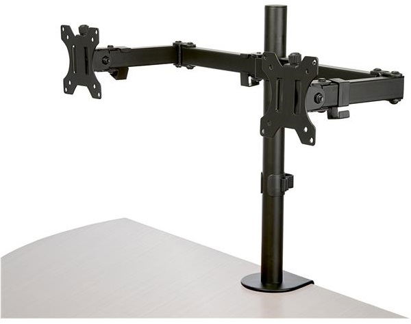 Work in comfort while saving space. This highly functional desk mount dual monitor arm brings you a cost-effective and versatile solution to an ergonomic workspace. Enjoy a wide range of motion with the double-jointed crossbar design plus tilt, swivel, rotation and height adjustment.