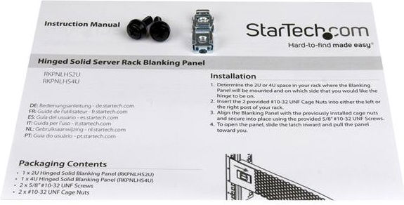 - This solid rack-panel features a hinged design that enables you to open it for fast and easy access to your rack-mounted devices. You can quickly open the panel, make your required adjustments and when you're finished, simply close the panel to restore the professional appearance and order of your server room. The panel is reversible, which enables you to install it on the left or the right side of your rack, to best suit your needs. This rack panel also comes complete with rack installation screws and nuts, giving you everything you need to ensure a hassle-free installation.