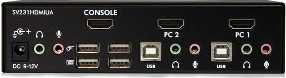 The SV231HDMIUA 2-port USB HDMI KVM Switch lets you control two USB-enabled multimedia computers or devices with HDMI video interfaces, using a single peripheral set/console (USB keyboard, mouse, monitor, speakers and microphone). A highly versatile KVM solution, the USB HDMI KVM Switch features an integrated 2-port USB 2.0 hub that lets selected computers access shared high speed USB devices, eliminating the cost of duplicate USB peripheral purchases.