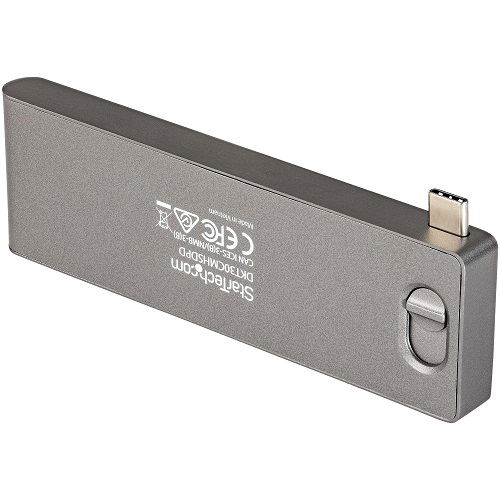 The portable docking station supports a single HDMI monitor up to 4K 30Hz (3840 x 2160p) to create a powerful workstation. It can also connect to an ultrawide monitor.