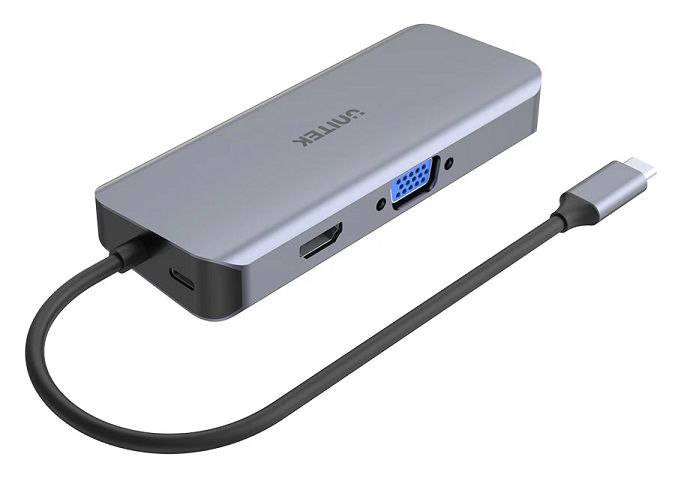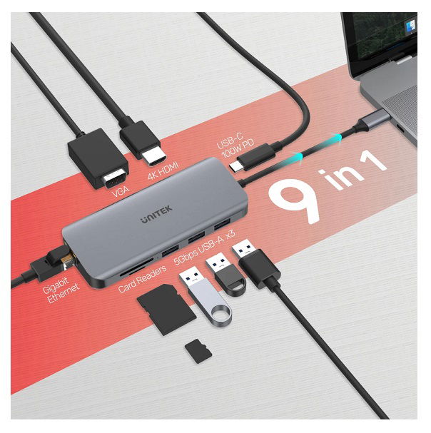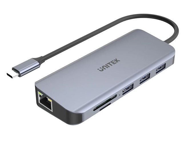 Unitek's uHUB N9 Plus combines three USB 3.1 Gen1 5Gbps ports, dual display outputs, a Gigabit Ethernet RJ45, dual card readers, plus the forceful Power Delivery 100W charging via the USB-C. HDMI supports up to 4K 30Hz Ultra HD, while MST allows streaming the independent screens to both HDMI and VGA at a lower resolution.